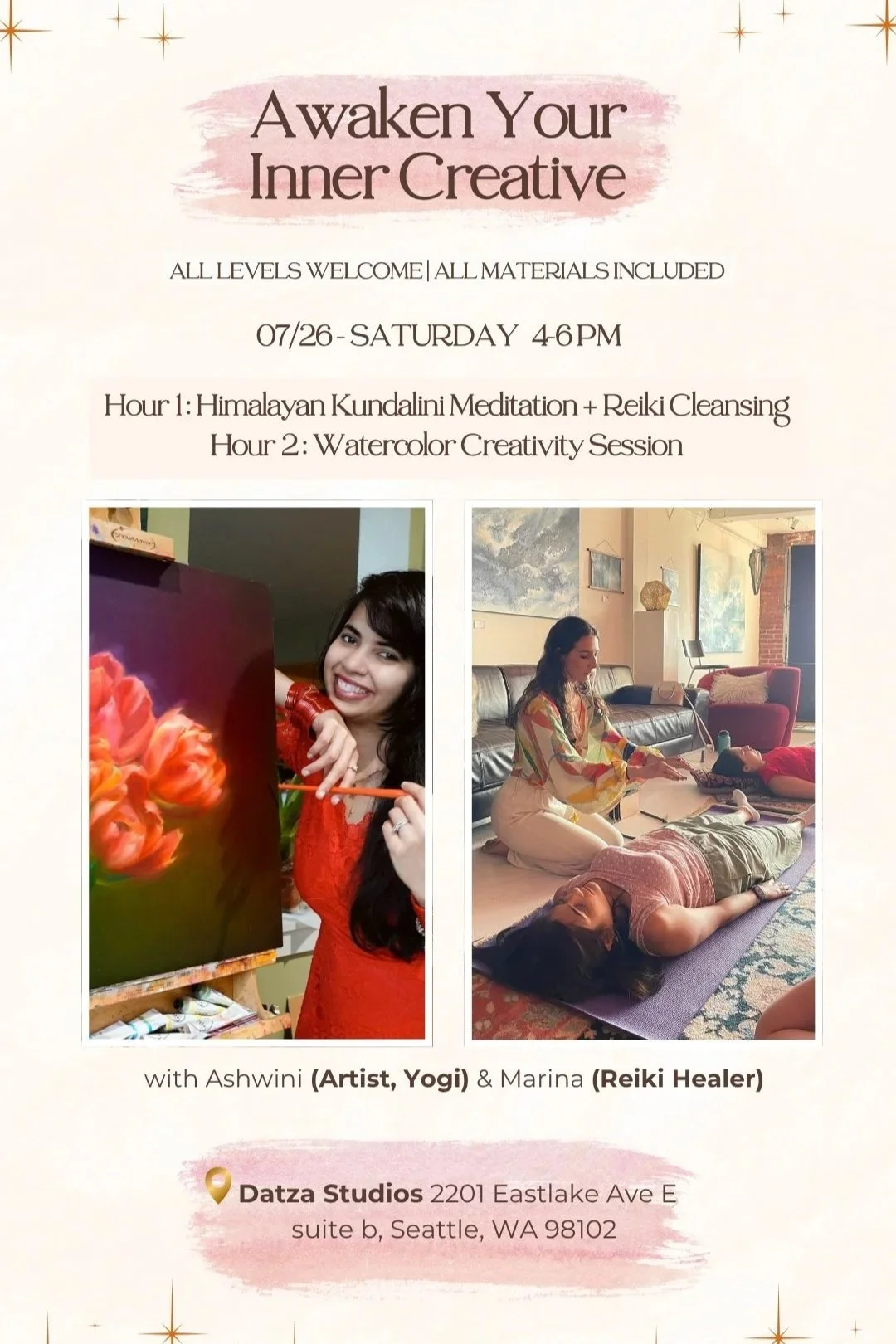 In this immersive two-hour workshop, you'll be guided by Ashwini 500-HR E-RYT (Former Lead Yoga Trainer at University of Washington and fine artist, and Marina, a certified Chopra Reiki Healer, as you journey inward to unlock your creative flow.